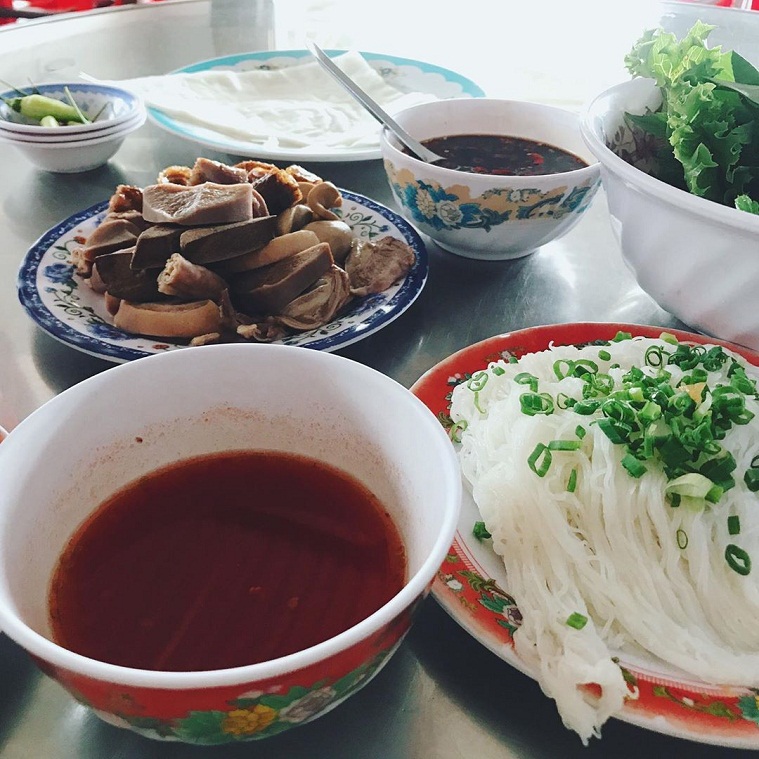 Bánh hỏi là một món ăn sáng quen thuộc của người dân Phan Thiết. Phần bánh hơi giống như bún tươi, ăn cùng với lòng heo ngon và nước mắm ớt chua ngọt. Món ăn này trông tưởng đơn giản nhưng cách chế biến lại rất công phu đấy! Để làm ra được phần bánh trắng tinh tươm thế kia, người ta phải ngâm xả gạo đến 3, 4 lần rồi mới bước vào các công đoạn tỉ mỉ khác.