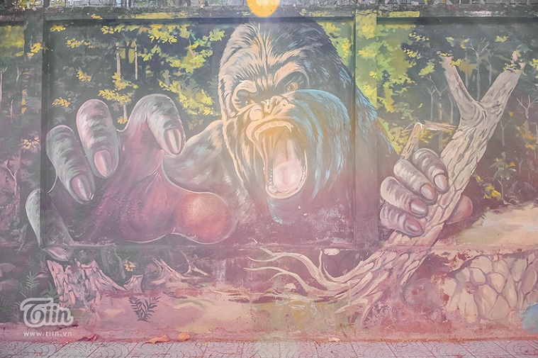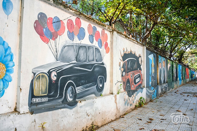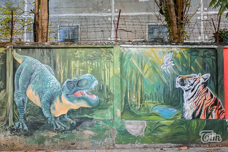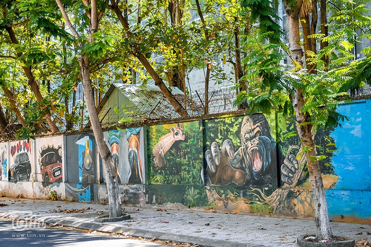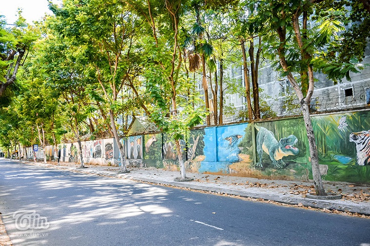 Nằm một góc trên đường Nguyễn Phong Sắc (Cẩm Lệ, TP. Đà Nẵng), bức tường là bến đỗ của hàng chục bức họa sống động, tái hiện hình ảnh động vật, mô hình, cuộc sống. Đây là bức tường nằm khu vực công ty thuốc lá cũ.