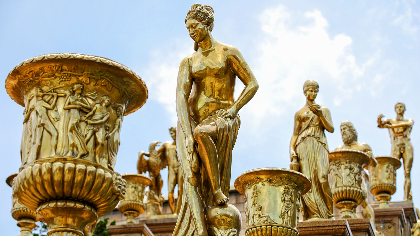 Nổi bật nhất trong quần thể các bức tượng vàng tại Thác Thần Mặt Trời là cụm tượng trung tâm tại đài phun nước, nơi Thần Mặt Trời Helios điều khiển cỗ xe được kéo bởi 5 chú chiến mã.