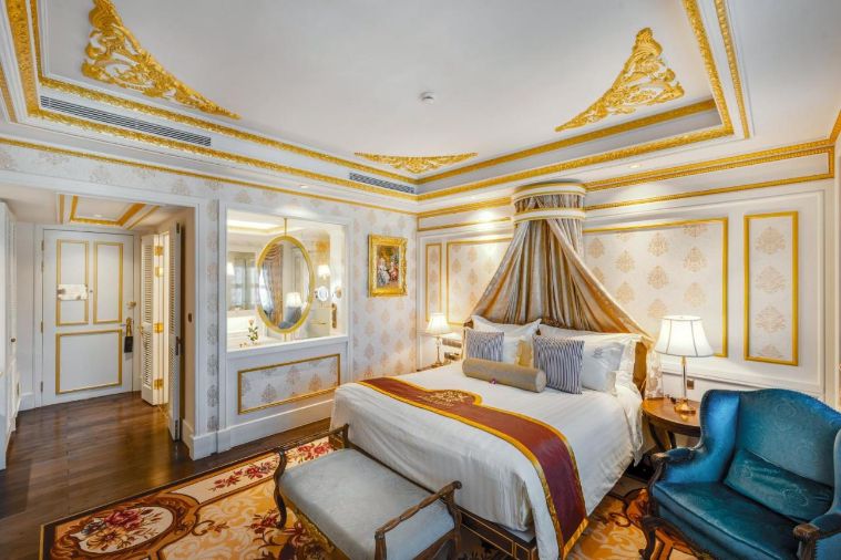 Bạn có thể chọn nghỉ ngơi ở phòng giường đôi hoặc phòng có 2 giường đơn tùy theo số lượng người. Đúng như tên gọi, căn phòng hoàng gia được trang trí với những hoa văn họa tiết bắt mắt với tone màu hoàng kim quý phái, cùng với đó là những nội thất sang trọng cao cấp thiết kế kiểu Pháp xưa.