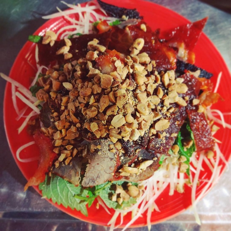 Đi dọc quanh các con phố ở Hà Nội, bạn sẽ dễ dàng bị thu hút bởi những quán ven đường bán nộm thịt bò khô – món ăn đường phố rất đỗi quen thuộc. Vị thơm nồng của thịt bò khô kèm lạc vụ, vị cay cay của nước trộn hoà cùng vị thanh mát của rau củ đã làm nức lòng bao thế hệ.