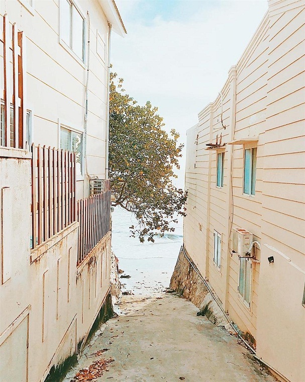 Thoạt nhìn qua chỉ là một con hẻm nhỏ bình thường với hai bên là bức tường vàng, cuối đường đường là tán cây xanh ngát, đi thêm một đoạn nhỏ nữa là đến biển ấy thế nhưng khi lên hình lại nhìn như ở một khung trời Tây xa xôi nào đó mà những người đã từng đến đây rồi cũng khó lòng mà phát hiện ra.