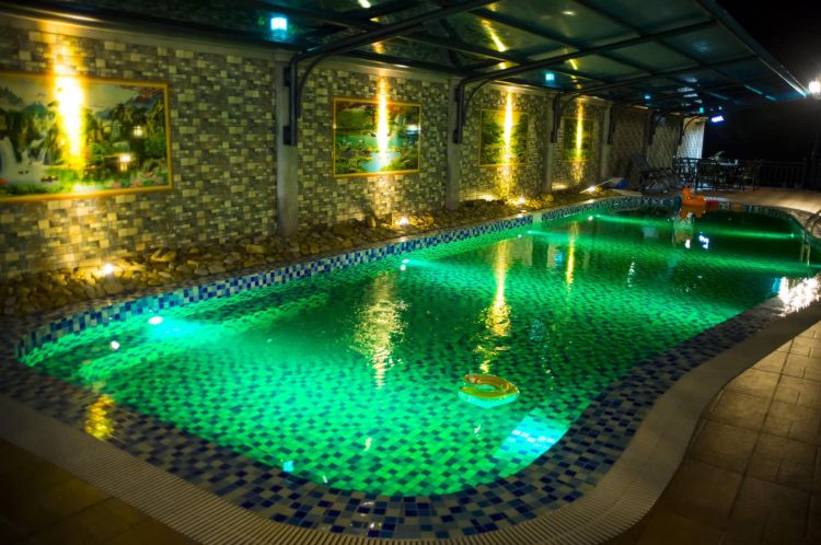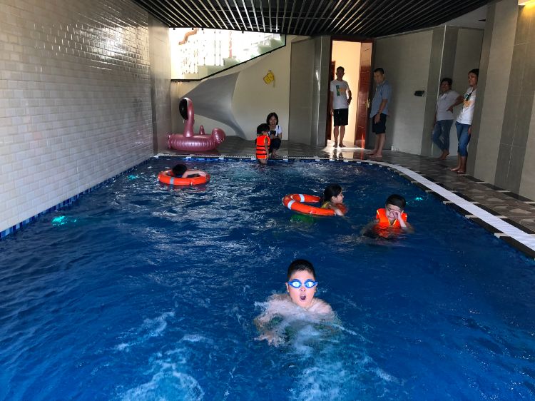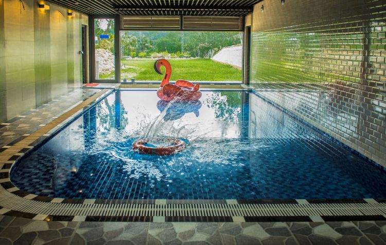 Bể bơi bốn mùa trong nhà kèm theo các hệ thống bị bơi ngược dòng, massage và 2 khu WC có cabin tắm trắng.
