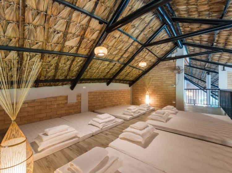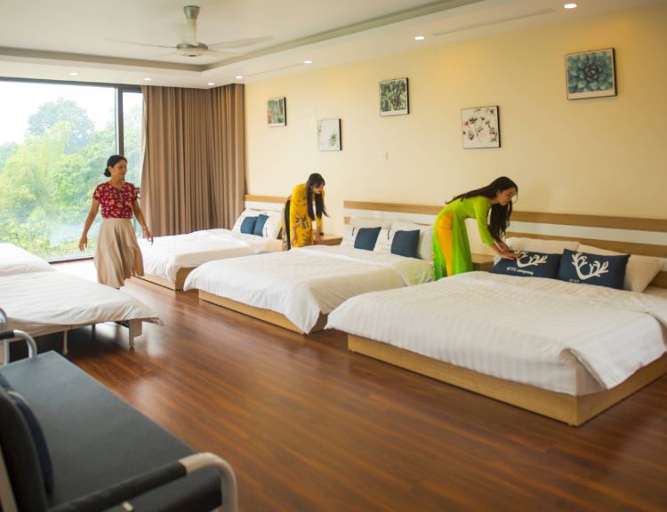 1 Phòng ngủ cộng đồng gồm 9 đệm đơn 120cm với chăn ga gối cao cấp kèm khăn tắm.