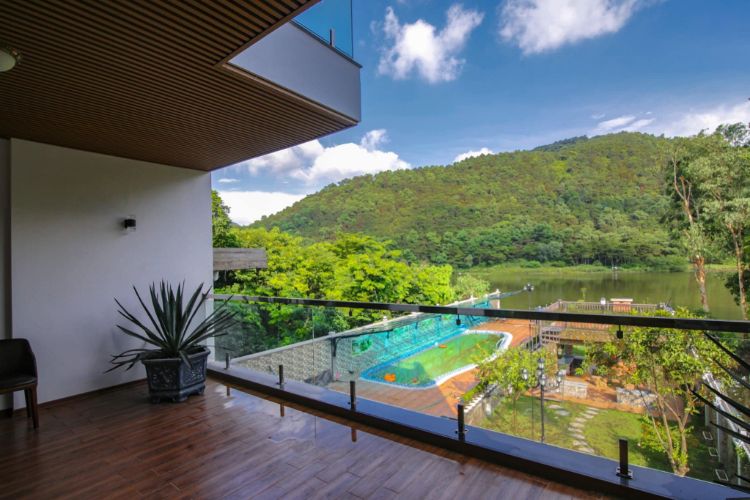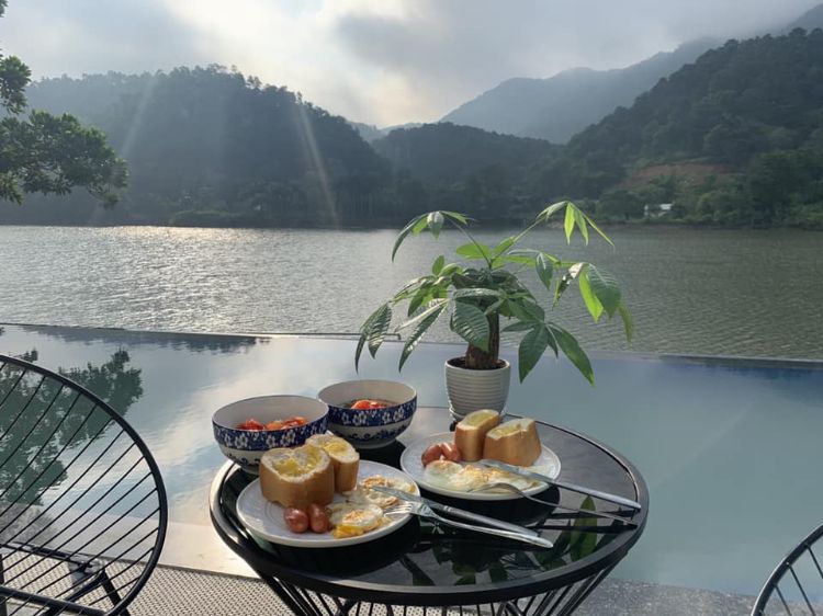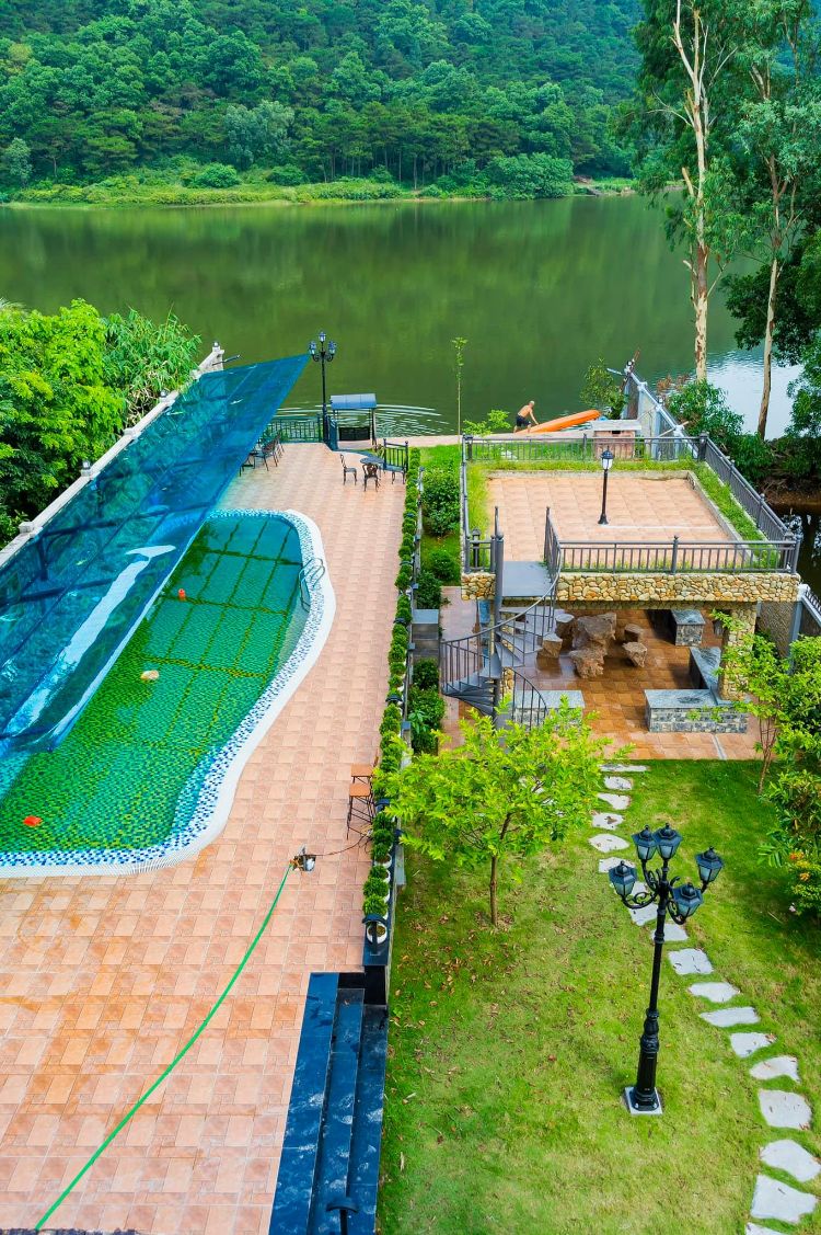 Bể bơi, sân vườn và khu ăn uống ngoài trời view hồ cực đẹp.