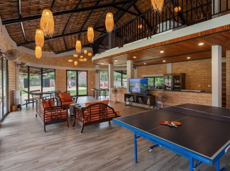 Căn resort rộng rãi này còn có khu vực nhà hàng phục vụ cho khách với sức chứa hơn 100 người. Những cặp đôi thường chọn đây là địa điểm tổ chức đám cưới. Các công ty thì lựa chọn để sinh hoạt cộng đồng, miễn phí sử dụng không gian bếp với bộ bàn ăn, set up bát đũa, …