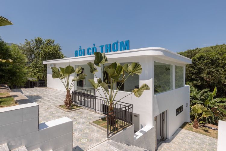 Khu resort nho nhỏ nằm trên ngọn đồi cỏ xanh, tông màu trắng trẻ trung nổi bật trên màu cỏ xanh. Điều này khiến người ta liên tưởng đến một nàng công chúa mặc váy trắng lạc giữa vườn xinh vậy.