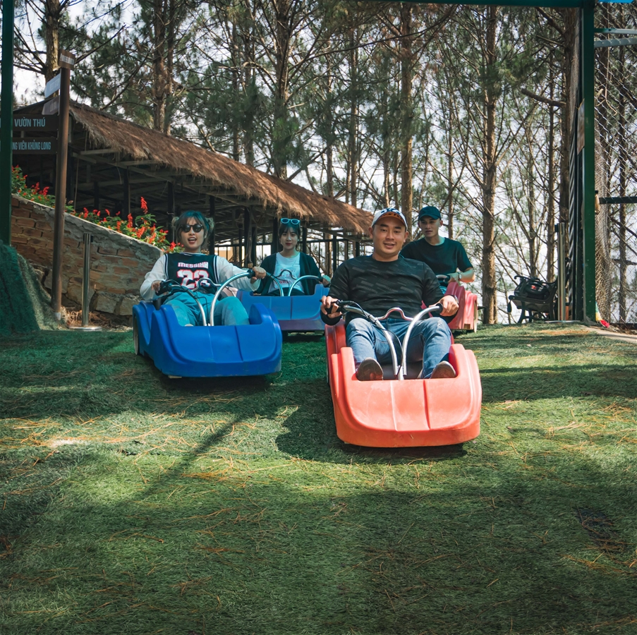 Quý khách chỉ cần ngồi trên xe và được đẩy chạy xuống cung đường dốc, lượn quanh những khúc cua thú vị và ngắm nhìn cảnh quan thiên nhiên xinh đẹp.