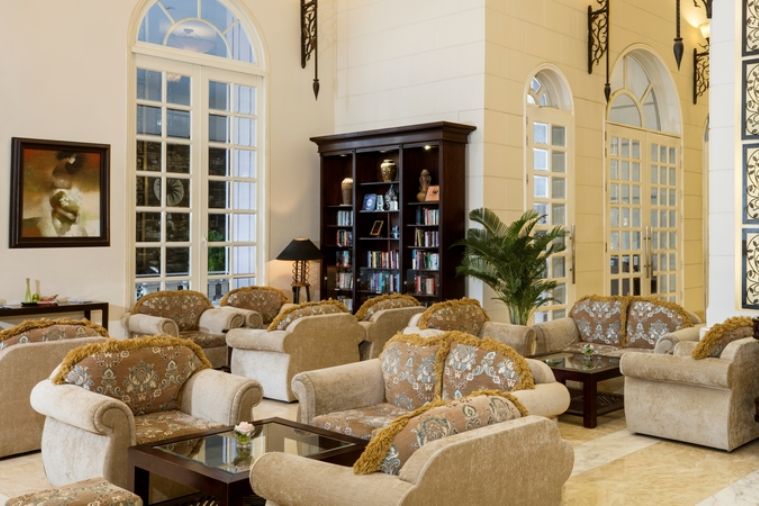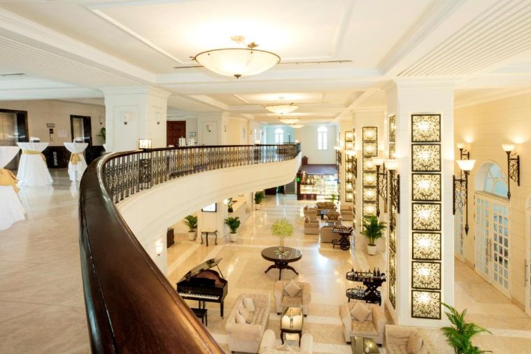 Nơi đây được thiết kế theo lối kiến trúc Đông Dương tráng lệ đẹp mắt. Ngay khi đặt chân vào bên trong của khách sạn du khách sẽ choáng ngợp bởi sự lộng lẫy của khách sạn, với những đồ nội thất lộng lẫy sa hoa, những bộ salon cao cấp, kệ để đồ, bàn ghế tất cả đều làm từ những loại gỗ cao cấp nhất, kết hợp với ánh đèn vàng pha lê càng làm cho đại sảng được bao trùm bởi sự sang chảnh đắt giá hơn.